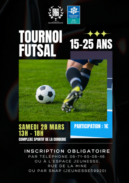 La Maison des Jeunes (MDJ), en partenariat avec la CAF du Nord, organise un grand tournoi de futsal pour les jeunes de 15 à 25 ans ! 📅 Samedi 28