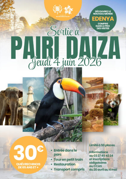 Le CCAS de Quievrechain organise une sortie à Pairi Daiza le jeudi 4 juin. 👉 Pour les Quiévrechinois de 65 ans et + 💶 Tarif : 30€, comprenant : •L’entrée