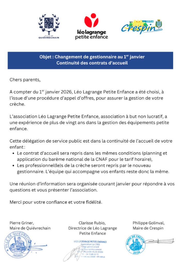 Communiqué sur l’accueil des enfants au sein des crèches de Quiévrechain et Crespin suite au renouvellement de la délégation du service public.