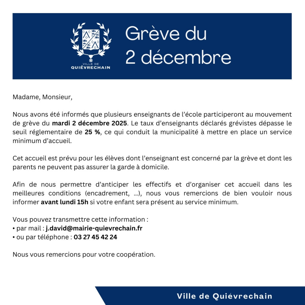 Grève du mardi 2 décembre – Service minimum d’accueil