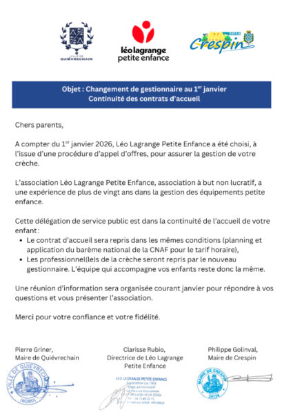 Communiqué sur l’accueil des enfants au sein des crèches de Quiévrechain et Crespin suite au renouvellement de la délégation du service public.