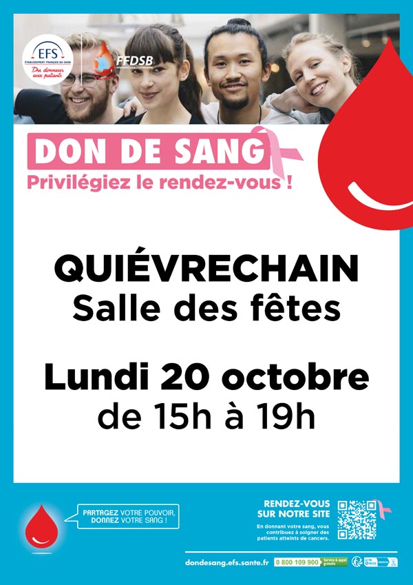 Salle des fêtes Place Roger Salengro, Quiévrechain🩸 Don du sang à Quiévrechain ! 🩸 Et si vous preniez une petite heure pour sauver des vies ? 👉 Rendez-vous lundi 20 octobre 2025 à la salle des fêtes, de 15h à 19h, pour une nouvelle collecte de sang. Chaque goutte compte, chaque don fait la différence. Venez seul, entre amis ou […]